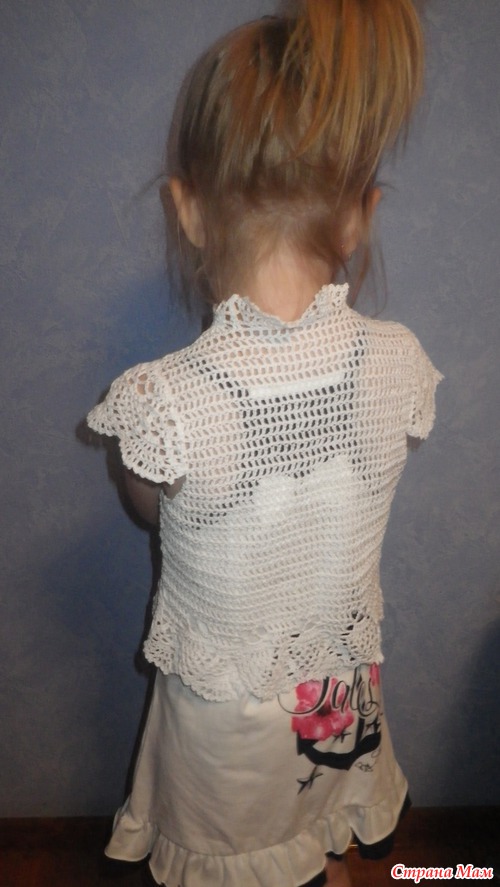 Болеро связано из ниток Макси, мерсеризированный хлопок, в 100 граммах 560 метров, ушло меньше, чем 100 грамм на возраст модели 3 года.