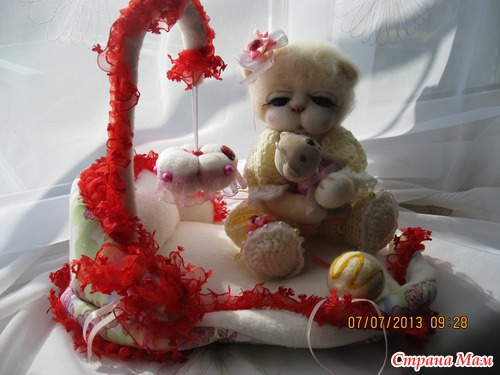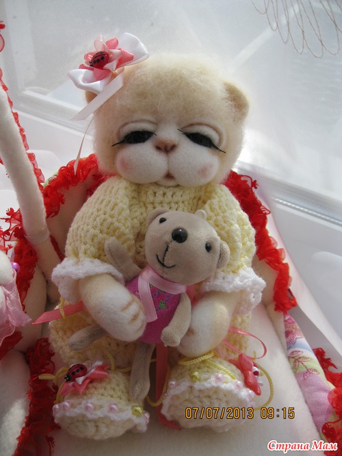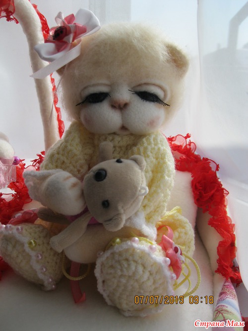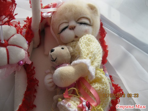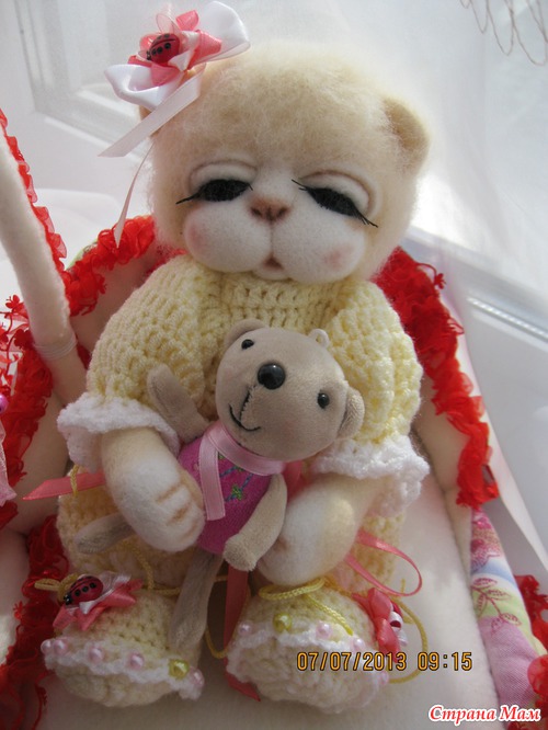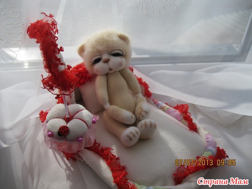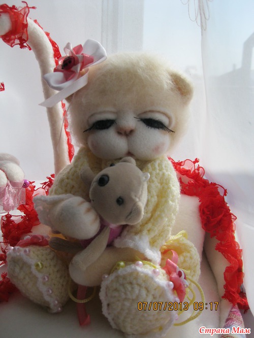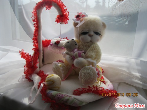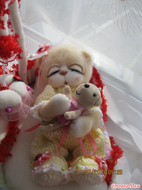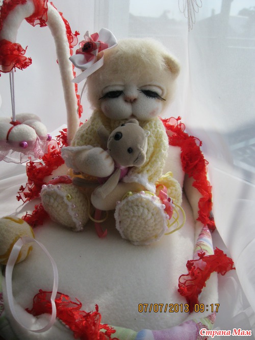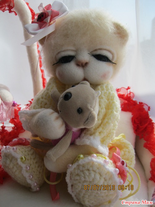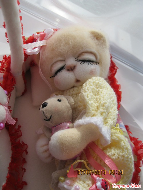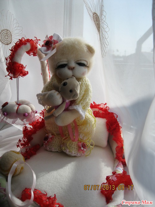 Вот вчера родилась маленькая кошечка. Ростиком 24 см. Сваляна из шерсти(меринос и кардочес)Головка поворачивается. Глазки открываются и закрываются. Может сидеть и стоять. Ручки сгибаются в локтях. Комбинизончик и пинеточки связаны крючком. Украшения из атласных лент. Кроватка с мобильчиком. Мобильчик крутиться. Можно его снять или поменять другую игрушечку. Кроватка каркас плотный картон. Использовала цветной джинс и флис. Украшение ленты бабочки. Подушечка украшена лентами и цветочком. Размер кроватки 32 длина и 24 ширина.