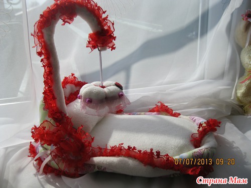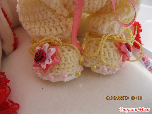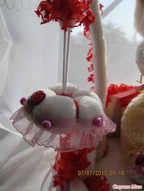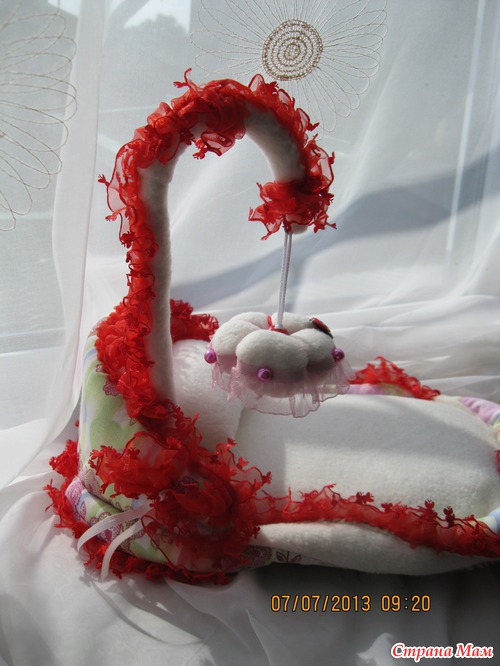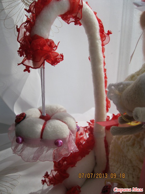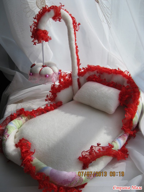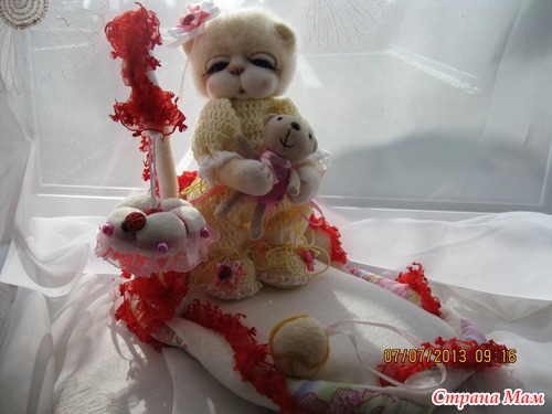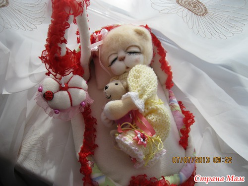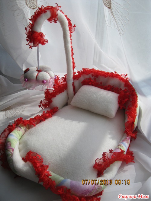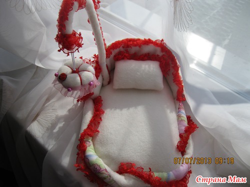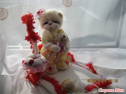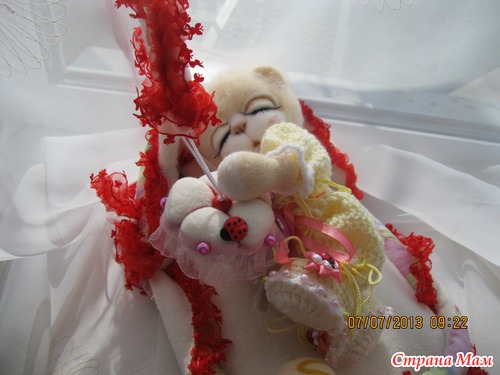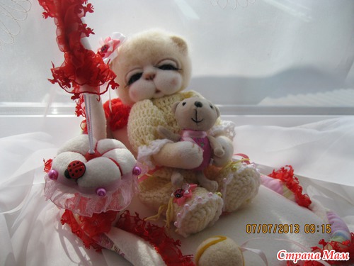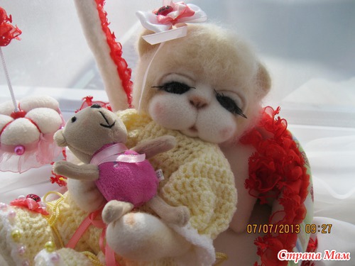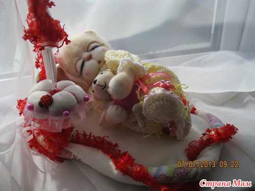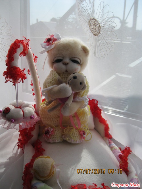Вот вчера родилась маленькая кошечка. Ростиком 24 см. Сваляна из шерсти(меринос и кардочес)Головка поворачивается. Глазки открываются и закрываются. Может сидеть и стоять. Ручки сгибаются в локтях. Комбинизончик и пинеточки связаны крючком. Украшения из атласных лент. Кроватка с мобильчиком. Мобильчик крутиться. Можно его снять или поменять другую игрушечку. Кроватка каркас плотный картон. Использовала цветной джинс и флис. Украшение ленты бабочки. Подушечка украшена лентами и цветочком. Размер кроватки 32 длина и 24 ширина.