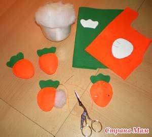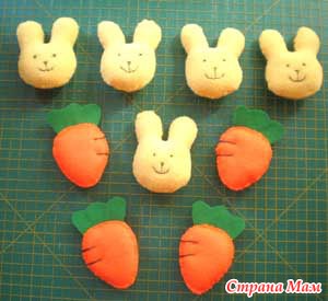 5. Теперь на обратных сторонах морковок и зайчиков пришиваем маленькие липучки.