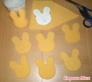 3. Зайчиков я выкраивала из жёлтого флиза – 10 деталей.