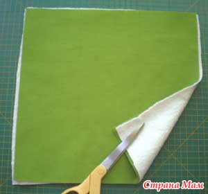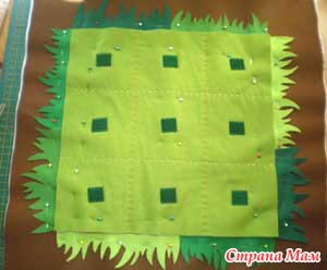 «Травка» представлялась плотной поверхностью, но мягкой, поэтому под квадрат из светло-зелёного фетра размером 30*30 см вырезала чуть больший из хлопкового ватина.