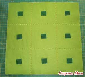 8. На зелёном квадрате (фетр+ватин) расчерчиваем сетку: 9 квадратов по 10 см и, сколов слои (или склеив специальным клеем-спреем), выстёгиваем «пунктирные линии».