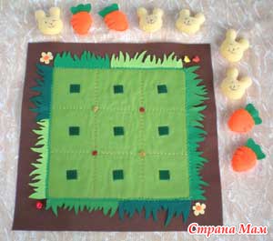 12. Всё! Подарок малышам готов! Садитесь поуютнее – и играйте в заячье-морковные «крестики-нолики»! Даже если это не сразу получится, не расстраивайтесь! Отдирая и прилепляя липучки, держа в ручонках мягкие, яркие поделки, малыши уже будут счастливы и этой своей радостью отблагодарят мамочек и бабушек-лоскутниц!