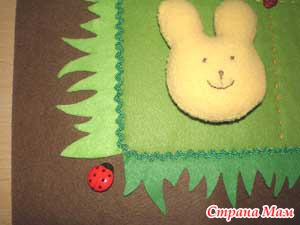 11. Чтобы ещё лучше закрепить «лужайку» на «земле», в точках пересечения линий квадратиков пришила декоративные пуговки – пчёлки, божьи коровки. А в уголках между «травками» - немного летних примет: цветочки из фетра и пуговки с бабочками и большой божьей коровкой.