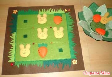 12. Всё! Подарок малышам готов! Садитесь поуютнее – и играйте в заячье-морковные «крестики-нолики»! Даже если это не сразу получится, не расстраивайтесь! Отдирая и прилепляя липучки, держа в ручонках мягкие, яркие поделки, малыши уже будут счастливы и этой своей радостью отблагодарят мамочек и бабушек-лоскутниц!