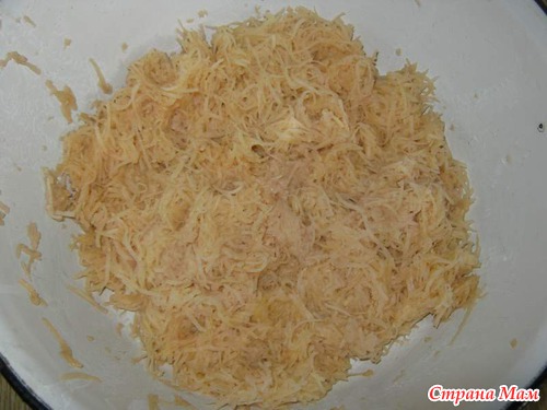 Трем картофель на мелкой свекольной терке. В электромясорубках есть такая насадка. ОТЖИМАЕМ