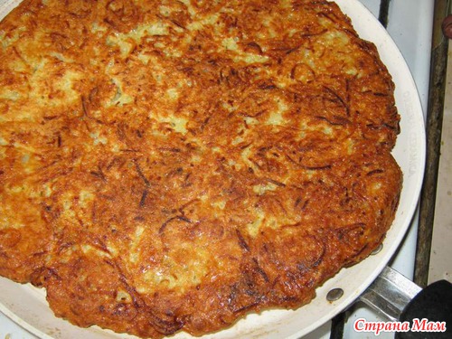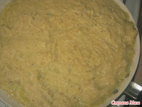 И выкладываем довольно толстым слоем на сковородку, смазанную маслом