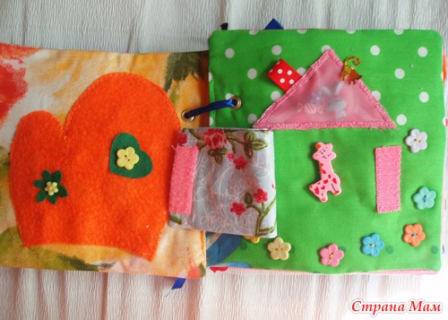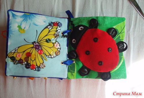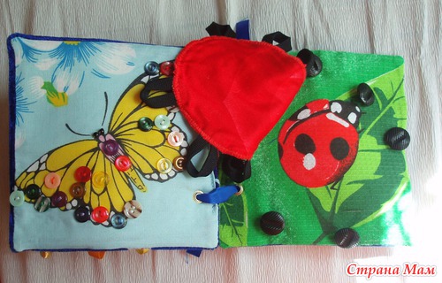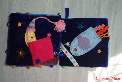 Страничка Варежка Внутри много бусин и пуговок разного размера, для массажа ручки ребенка.