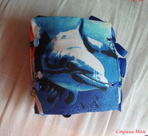 Задняя часть обложки тоже дельфин, книжка застегивается на пуговки.