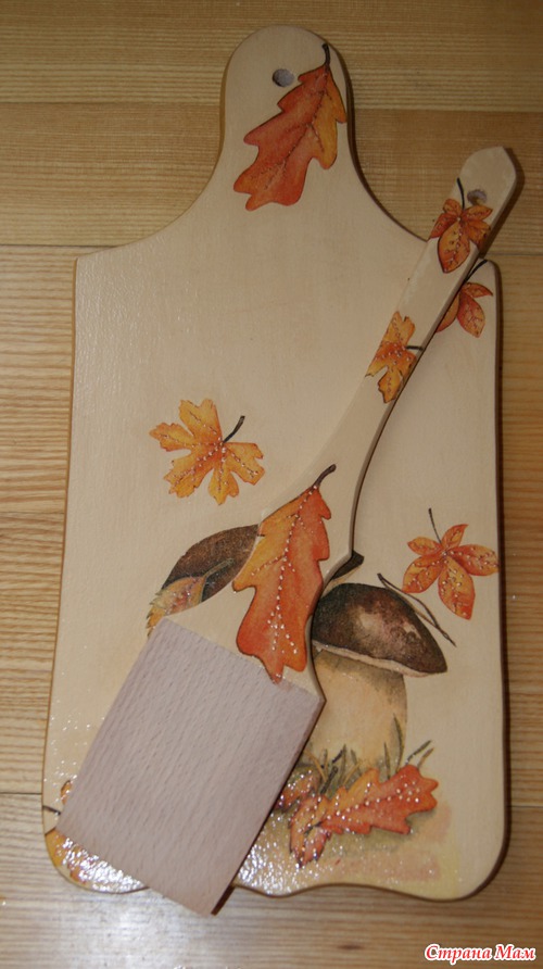 А вот хочу подарить свекровке на "новоселье" к свежеотремонтированной кухне. Досочку я сделала раньше, теперь к ней лопатка сваялась.
