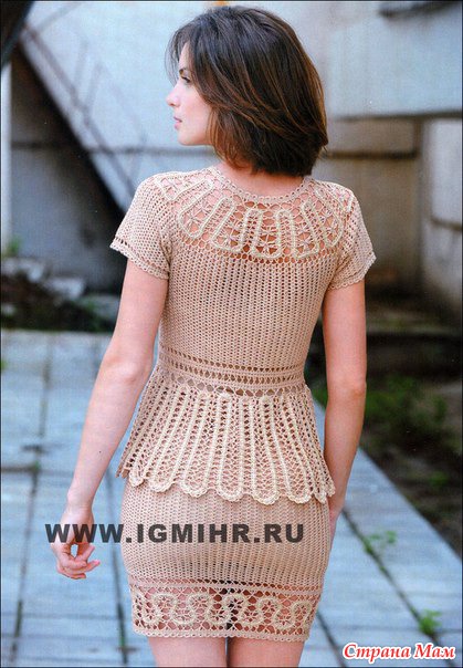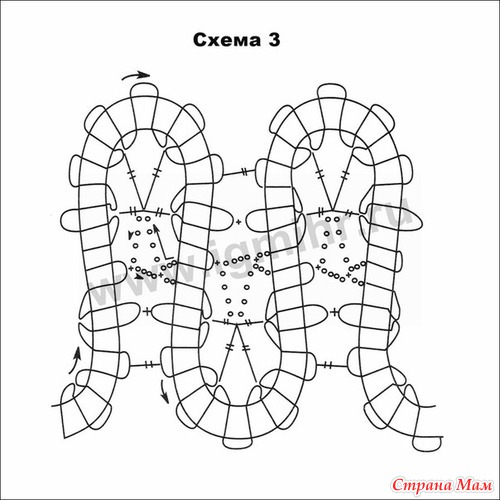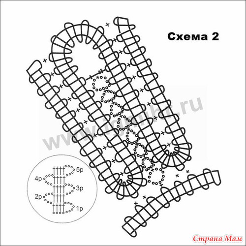 Связать цепочку из возд. п., согласно выкройке основным узором веерочки. Для увеличения размеров, постепенно менять число воздушных петель между веерочками, добавляя сначала одну, затем 2 возд. п. для вывязывания линии бедер. Для зауживания юбки постепенно убавлять воздушные петли в соответствии с выкройкой. Низ юбки оформить кружевной вставкой согласно схеме 3. Декорировать вставку шелковой сканью. Обвязать «ушки» ст. б/н. По линии талии вязать две прямые брюггские тесьмы и для приталивания, если нужно, уменьшать число «ушек» в процессе привязывания второй тесьмы. «Ушки» обвяжите ст. б/н.