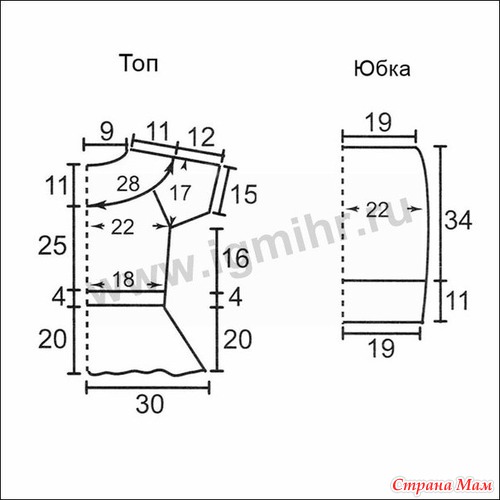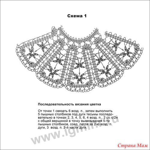 Начать работу с кружевной кокетки. Вязать кокетку из 12-ти фестонов по схеме 1. Желательно сразу проложить скань тамбурным швом шелковыми нитками, предварительно отпарив готовую кокетку. Топ вязать фоновым узором из веерочков по принципу реглана. Для этого разделить кокетку на 4 части, по 4 фестона на спинку и перед, и по 3 на рукава. Основной узор веерочки, которые состоят из *2 ст. с/н, 2 возд. п., 2 ст. с/н *. Для того, чтобы линии реглана сделать более заметными, нужно делать прибавку в веерочках (до 3-х 4-х прибавок) из 3-4 ст. с/н. Делать прибавки соответственно выкройке. По переду выполнить вытачки, для этого между ст. с/н вязать не 2, а 3-4 возд. п. До линии проймы топ вязать по кругу, затем оставить открытыми петли для рукавов и до линии талии довязать спинку и перед по кругу веерочками. Затем привязать прямую брюггскую тесьму и если надо, сделать убавления для линии талии в процессе привязывания второй брюггской тесьмы. Провязывать по 2 «ушка» вместе. Далее связать кружевную баску по схеме 2 и в процессе вязания крепить ее к прямой тесьме. Проложить скань вискозным шелком на баске. Затем довязать по кругу рукава. Низ оформить прямой брюггской тесьмой. Обвязать «ушки» ст. б/н по 5-6 столбиков в каждое «ушко».