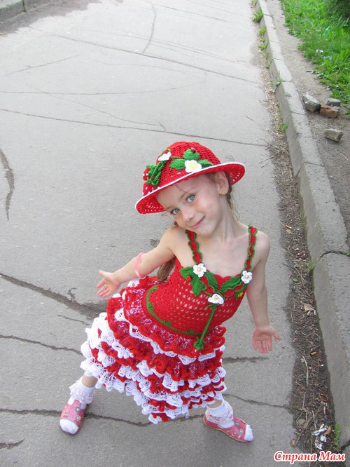 Основу платья вязала из СОСО, ушло 4 мотка по 50гр. Юбку связала сначала сеткой, а потом уже по сетке вязала "Дантелой". Дантелу брала сразу 2 мотка: красный и белый. Ушло по 1,5 мотка каждой.Ну а цветочки, листочки уже вязала из ириса.4-6 вечеров и платье готово.