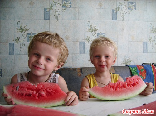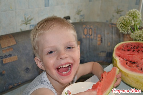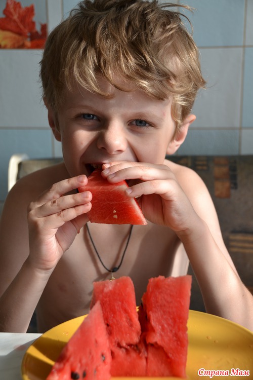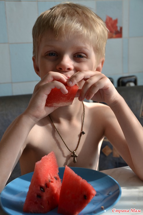Да, на второй сынок лицо руками закрыл, но никак не могла уговорить оторваться от арбуза