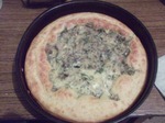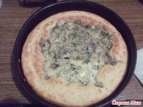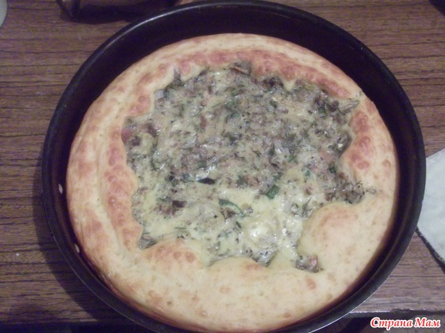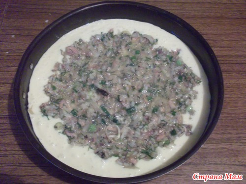 В сковороду или форму выкладываем тесто, на середину выкладываем начинку