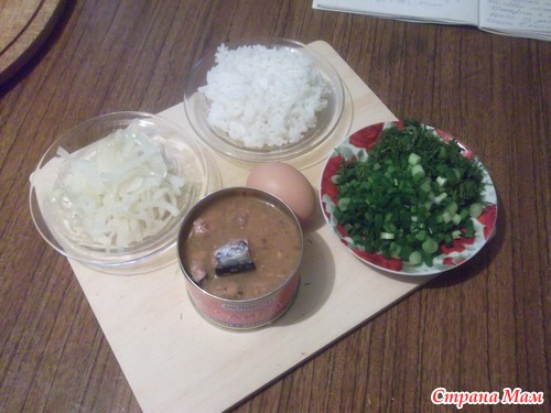 1 луковица, 2 - 3 горсти отварного риса, зелень, яйцо, рыбная консерва в масле или натуральная.