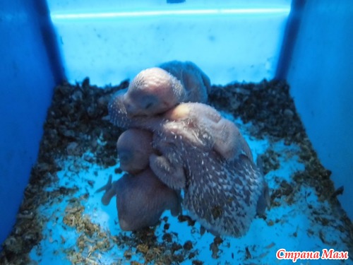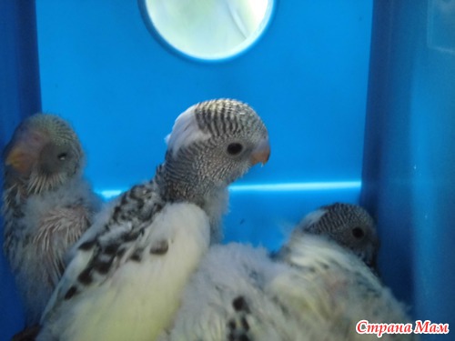 Но малыши стали расти, как в сказке:"не по дням, а по часам"! (да мы только и рады тому!) Мама с папой не ленились - откармливали оглоедов... Через неделю от род стали открываться глазки у старшего... потом и у всех остальных... Появились зачатки перьев и стал расти пушок. Пушок был светлый, а потому - вырастут у нас попугайчика, похожие на папу-Желтка...