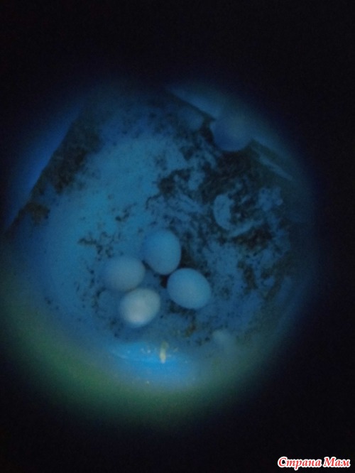 Ребята наши, не долго думая, обследовали новое жилье и самочка стала обустраиваться: выносила в клюве опилки, что были нами заботливо собраны и насыпаны на дно дуплянки... Вскоре появилось первое яичко, а за ним и еще парочка...