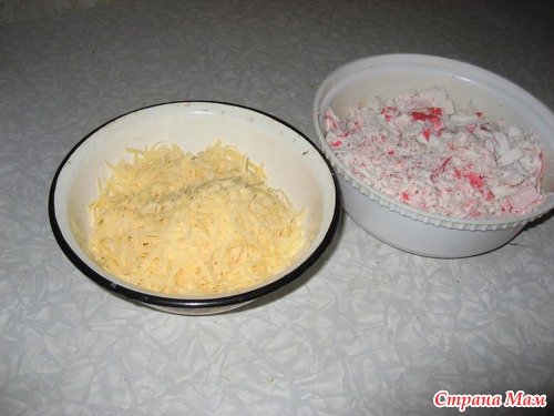 Для этого берём крабовые палочки натрите на крупной тёрке.