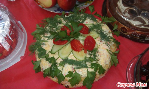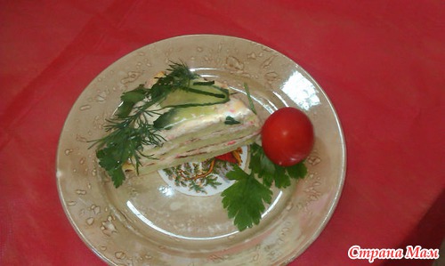 Коржи смазывать массой из моркови, лука, сеснока с зеленью,а сверху укладывать по всей площади коржа томатами. Таким образом формируется торт.