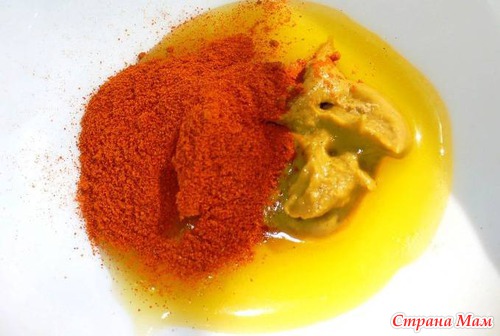 Затем приготовьте соус-маринад. Для этого в глубокой тарелке смешайте мед, горчицу, паприку, соль, перец.