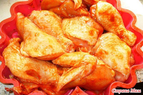 Каждый кусочек курицы смажьте подготовленным маринадом, уложите в форму для запекания.