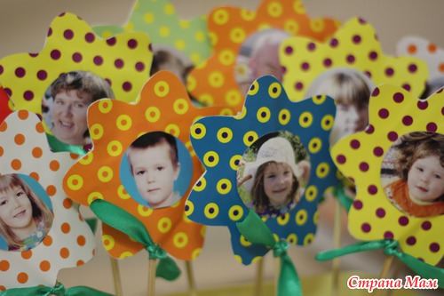 Процесс изготовления несложный. По шаблону нарисовали цветы, вырезали их. Приклеили фото в центр (фото я сама заранее вырезала). Далее цветы склеивали, вставляя между собой палочки для барбекю. Завязали ленточки. Вазу делали давно из пустой емкости от порошка для посудомоечной машины. Наклеили салфетку, подрисовали красками. Изначально ваза была очень высокой и с ручкой, но мы ее обрезали под цветы. В вазу засыпали рис.