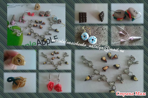 "Вкусняшки":комплект "Мороженое" (серьги и кулончик), серьги-гамбургеры, серьги-пончики с глазурью, и серьги-пусеты "Шоколадки"...