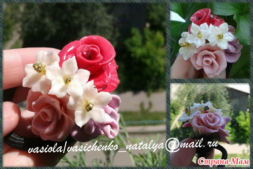А это резиночка для волос с цветами, созданными из холодного фарфора: