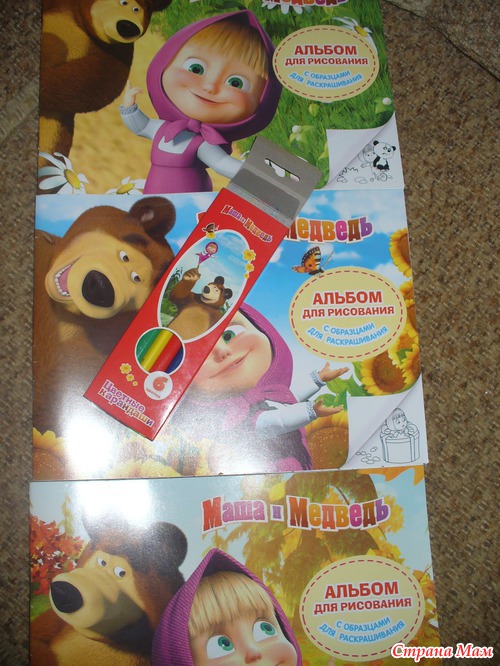 А еще замечательные альбомы-раскраски (я таких даже не видела) и карандашики с Машей