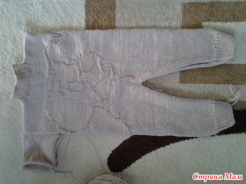 дело в том, что я сейчас довязываю комбинезончик для сынишки, он бежевого цвета, с самого начала хотела комбинировать цвета, но потом решила связать с рисунком, в результате рисунок получился малозаметным и только на спине, а спереди ничего, очень скучно