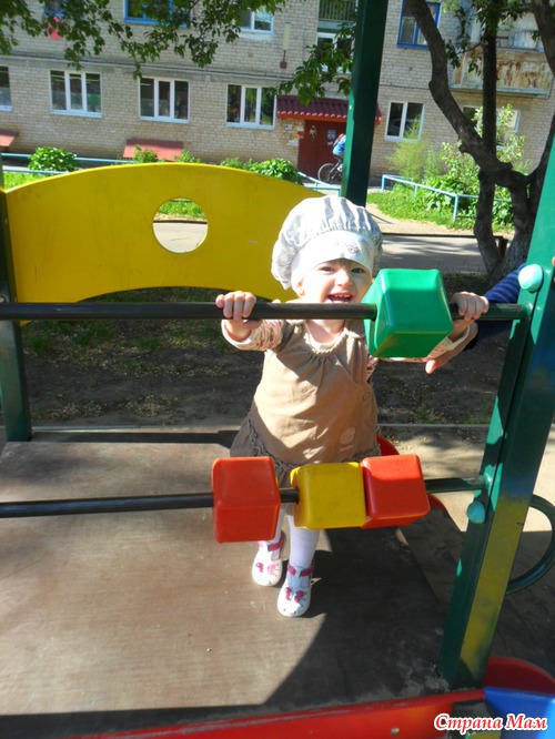 А так вообще очень подвижная(иногда я говорю, что она маленькая обезьянка)все бы лазила везде, на турнике повисеть это любимое наше занятие. спокойно поднимается по лестнице. но вот спускаться не умеет
