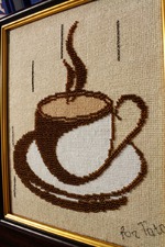 фон и серединка чашечки нитками, остальная чашка и дымок бисером. Бисер правда оказался больше квадратиков, так что пришлось выкручиваться