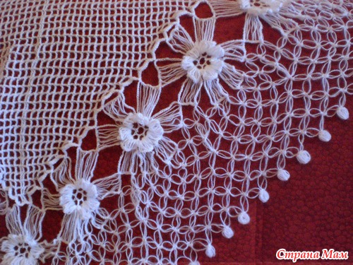 Внесла изменения, решила присоединять не просто цепочкой из ВП, а обвязать край СБН одновременно присоединяя цветочки. Начала обвязывать с самой первой петельки. Получилось так: