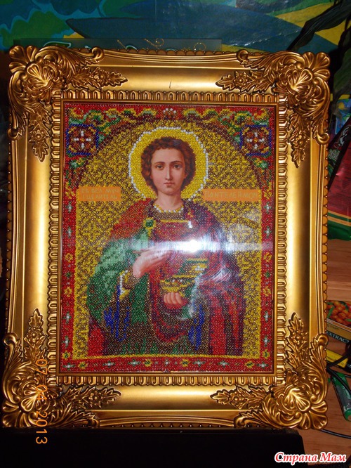 Еще весной закончила икону "Святого Пантелеймона". Заказывала через интернет набор фирмы "Новая Слобода", размер 18x23 см, 11 цветов. Работа принесла большое удовольствие и большую радость заказчице. Рамку купила в магазине и сама оформила, правда без косячков не обощлось... А вот результат: