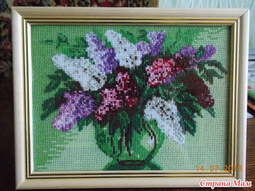 А затем, начала работу над вышивкой по рисунку от "Матренинного посада", размер 21*30 см, правда вошла в рамку 15*30 см. Оформила тоже сама, подарю очень хорошему человеку. Вышивать по готовому рисунку не очень понравилось, так как не всегда ткань совпадает с рисунком... Да и подбор цветов принес немало хлопот... Но результат в рамке мне понравился даже очень...