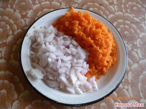 Морковь пропустить на мясорубке, лук мелко порезать.