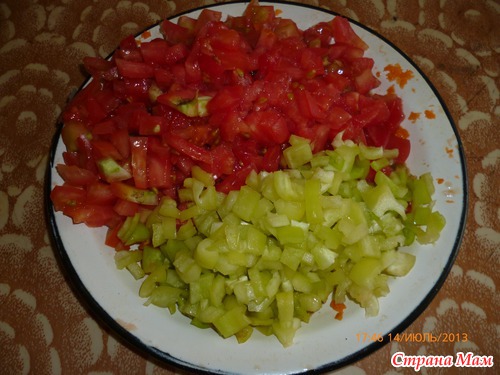 2. Помидоры потушить с перцем отдельно от моркови и лука. Все перемешать добавить кабачки и тушить минут 30, затем добавить соль, сахар и томатную пасту и потушить еще минут 10.