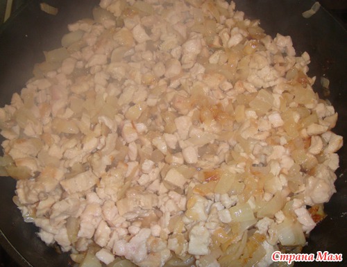 Куриную грудку нарезать мелкими кубиками и поджарить с луком. Посолить и поперчить по вкусу. Можно добавить любимую зелень: