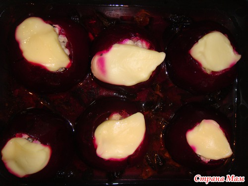 Уложить начинку в подсоленную свеклу. Сверху положить ломтик мягкого сыра (у меня адыгейский):