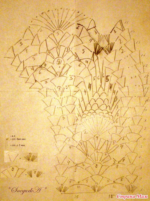 Схема от скатерти, и поэтому начало вязания для сарафана с 14 ряда, и примерно 6-8 рапортов, (зависит от размера и ниток) и длину вяжем свою! Немного изменён рисунок низа. Лиф сарафана можно сшить или связать спицами, крючком!
