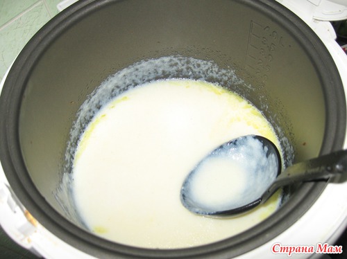 Перемешиваем, выливаем в чашу. Ставим на режим Варка на пару или Молочная каша (может быть и режим тушения подойдет, но я его не пробовала) - на несколько минут буквально, пока не станет горячим. На режиме варка на пару через 2-3 мин. оно уже кипит.