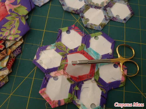 После того как все гексагоны соединены между собой, бумага вынимается, и вы получаете готовый верх для квилта. Стегать можно вручную или на машине.