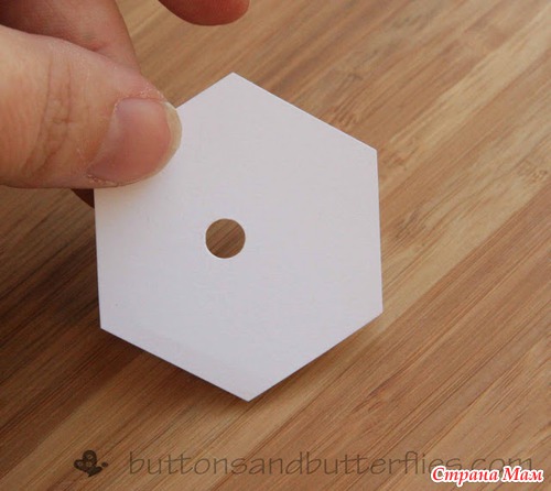 Шаблон гексагона может быть большим или маленьким в зависимости от вашего желания. Я предпочитаю 2 дюйма (примерно 5 см) от угла до угла. Бумага для шаблона должна быть плотной, как на библиотечных карточках или в альбомах для рисования, подойдут старые открытки и рекламные вкладки из журналов.