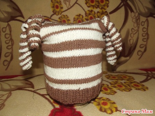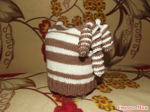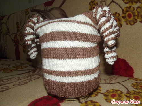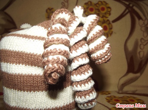 Связала для дочи осеннюю шапочку из полушерстяных ниток. Основа шапочки связана на машине, резинку привязала на спицах, а спиральки крючком. На ляле смотрится классно, но сфотографировать не удалось, сколько за ней не носилась)))
