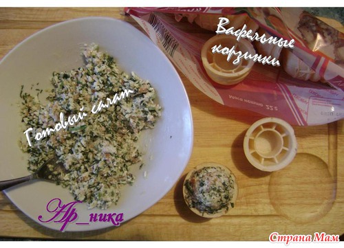 Заполняем салатом тарталетки. Полученной массы хватит примерно на 10 штук. У меня хватило только на 5