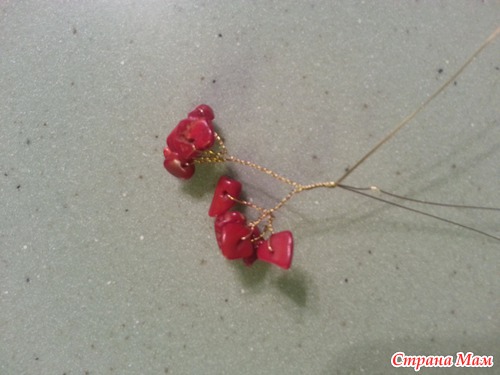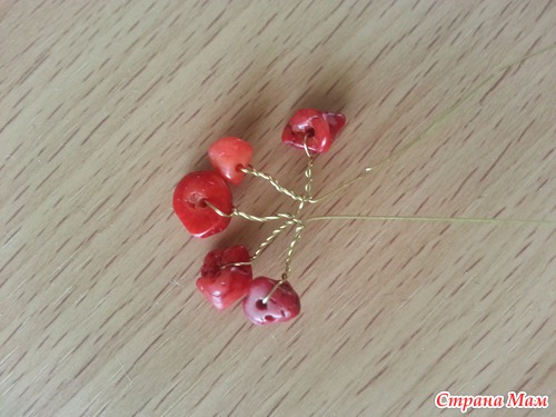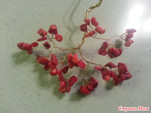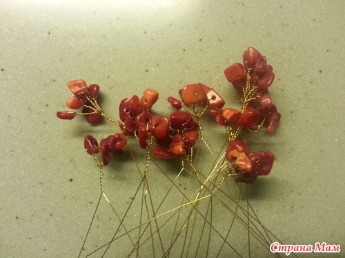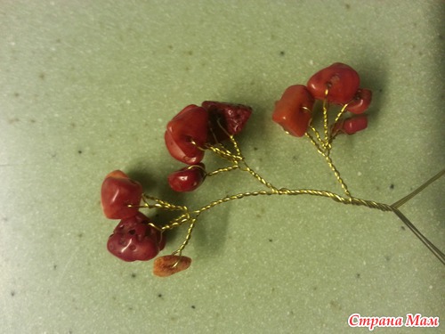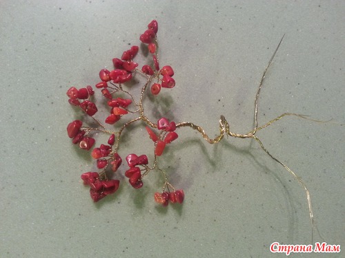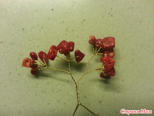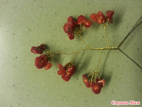 теперь формируем большие ветви. берем 1 веточку с камнями, делаем еще несколько оборотов проволоки и присоединяем другую веточку, снова несколько оборотов и снова прикручиваем еще 1 веточку