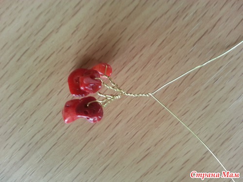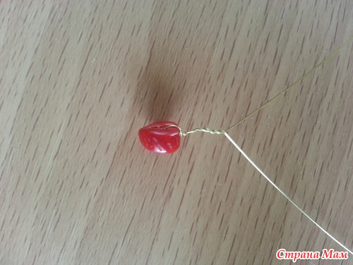 этап 1. нам нужно накрутить веточки. берем кусок проволоки около 50 см на середину проволоки надеваем 1 камешек и скручиваем проволоку на 5 оборотов.