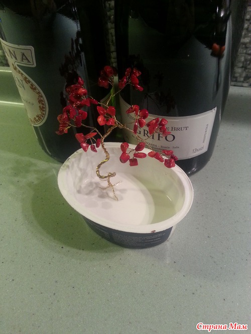 этап 2. дерево нам нужно посадить. здесь никакого секрета нет. разбавляем гипс водой согласно инструкции на упаковке и заливаем его в стаканчик от йогурта. размещаем в нем дерево так, чтобы оно не упало. у меня под рукой (на столе стояли бутылки и я облокотила деревце на них. иногда подставляю чашки, на вилках даже один раз стояло дерево. раньше вообще дерево как бы подвешивала.